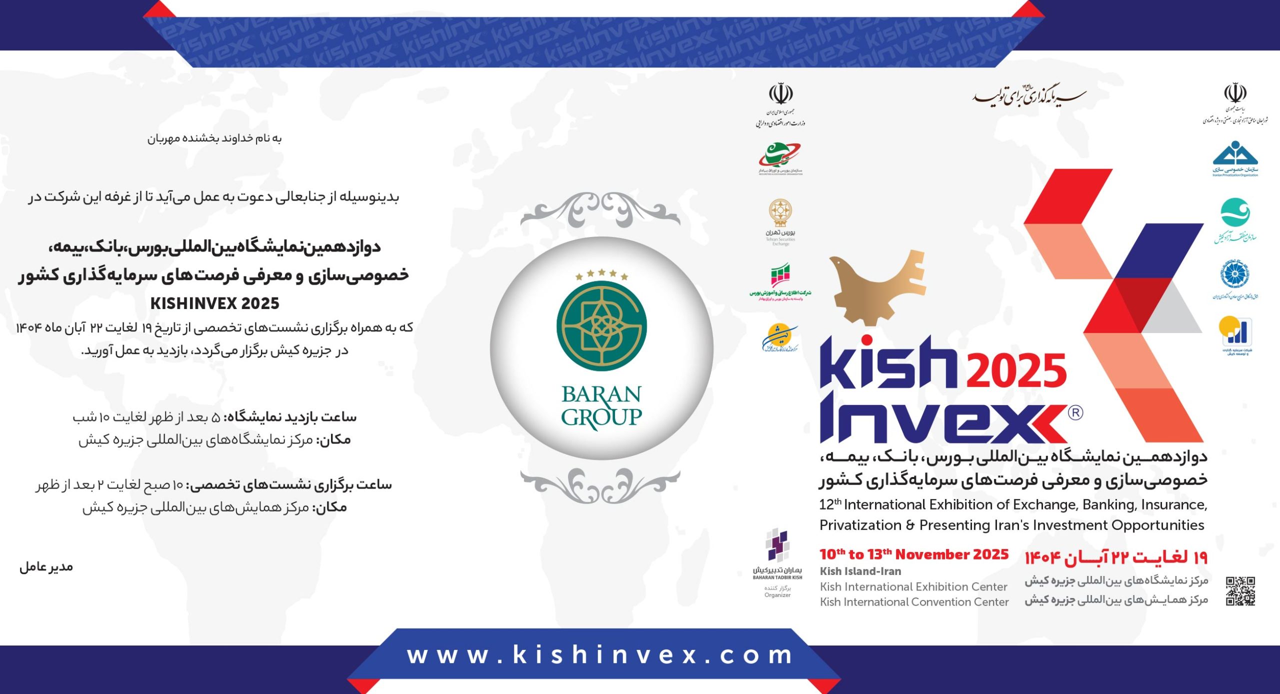دوازدهمین نمایشگاه بینالمللی بورس، بانک، بیمه، خصوصیسازی و معرفی فرصتهای سرمایهگذاری کشور KishInvex۲۰۲۵ از ۱۹ لغایت ۲۲ آبان ۱۴۰۴ از ساعت ۱۷ الی ۲۲ در مرکز نمایشگاههای بینالمللی جزیره کیش برگزار میشود.